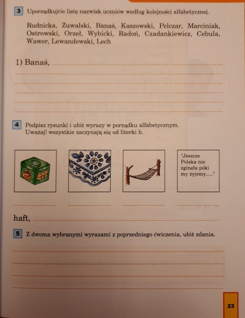 Na dzisiejszych zajęciach poznaliśmy wiersze o tematyce patriotycznej, legendę o Lechu, Czechu i Rusie. Omawialiśmy symbole Polski oraz ich znaczenie dla każdego Polaka – podręcznik str. 4-11. Poznaliśmy także kolejne zasady pisowni wyrazów z „u”, a także przypomnieliśmy sobie polski alfabet. W ramach pracy domowej należy nauczyć się czytać i opowiadać poznaną dzisiaj legendę, zrobić zadanie 7 str. 11 z podręcznika, zrobić ćwiczenia ze str. 7-9 – ćwiczeniówka oraz ćwiczenia dotyczące porządku alfabetycznego (w załączeniu). Za tydzień będziemy omawiać książkę „Jacek, Wacek i Pankracek”. Proszę o przeczytanie lektury.