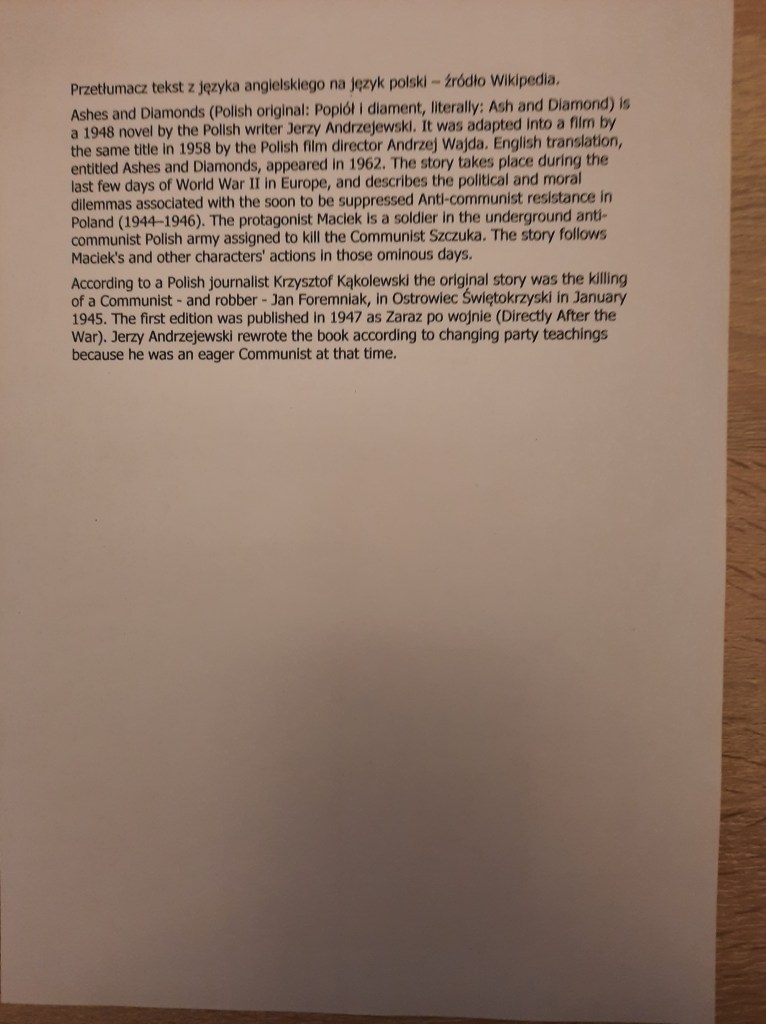 Na zajęciach zaczęliśmy omawiać książkę Jerzego Andrzejewskiego „Popiół i diament”. Mówiliśmy o ważnych wydarzeniach historycznych związanych z książką – II wojna światowa i powstanie Armii Krajowej oraz tworzenie PRL, omawialiśmy genezę utworu i jaką Polskę i ideologię wspiera autor książki oraz obraz rzeczywistości przedstawiony w powieści wobec prawdy historycznej. Robiliśmy ćwiczenie z Zeszytów Szkolnych nr 2 str. 24. W ramach pracy domowej proszę o przetłumaczenie z języka angielskiego na język polski załączonego tesktu, oraz o napisania eseju na jeden z podanych tematów: