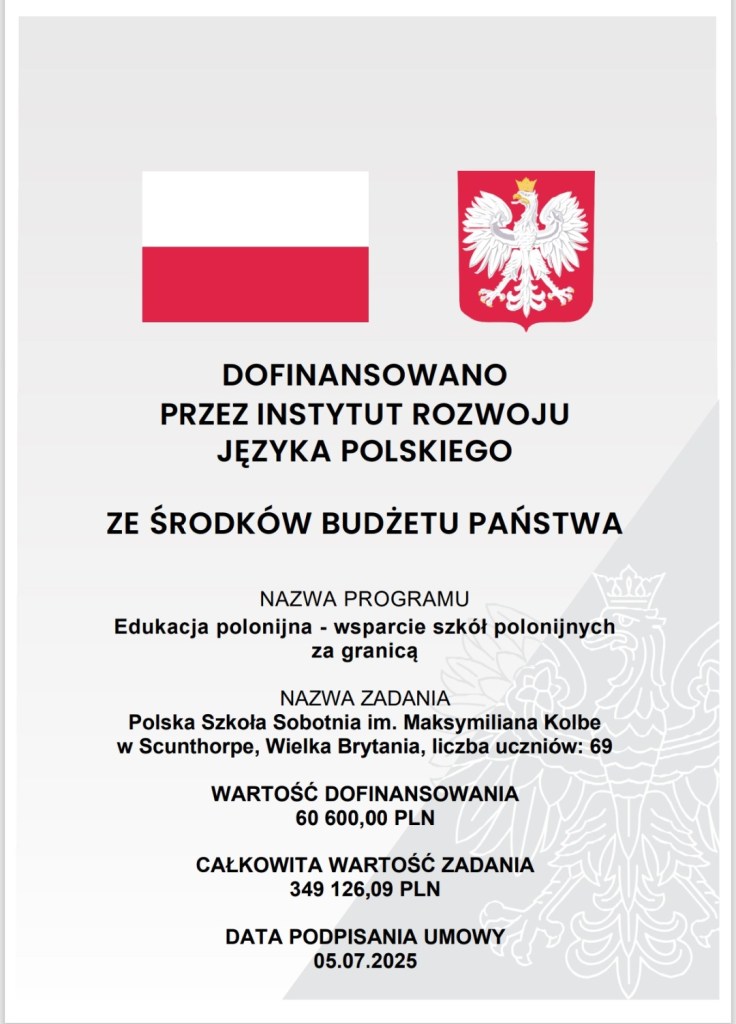 Z przyjemnocią informujemy, że nasza szkoła, za pośrednictwem Stowarzyszenia „Wspólnota Polska”, otrzymała dofinansowanie z Instytutu Rozwoju Języka Polskiego im. Maksymiliana Marii Kolbego, pochodzące ze środków budżetu Państwa, w ramach konkursu „Edukacja Polonijna – wsparcie szkół polonijnych za granicą”.
