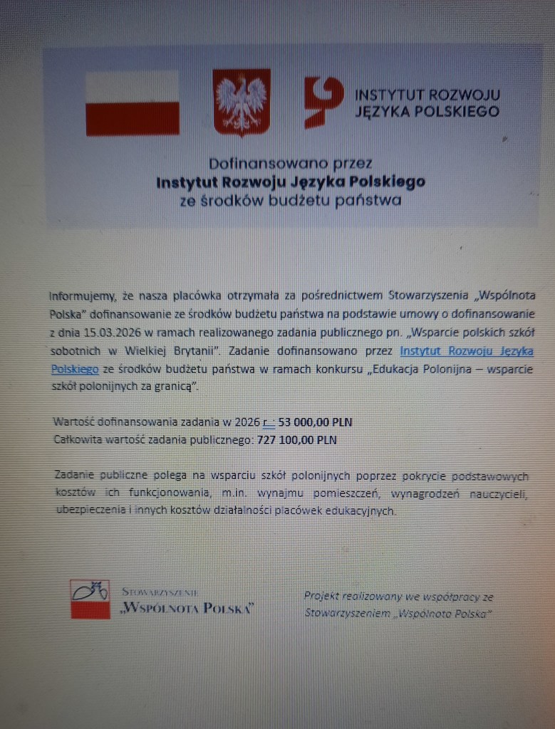 Z przyjemnocią informujemy, że nasza szkoła, za pośrednictwem Stowarzyszenia „Wspólnota Polska”, otrzymała dofinansowanie z Instytutu Rozwoju Języka Polskiego im. Maksymiliana Marii Kolbego, pochodzące ze środków budżetu Państwa, w ramach konkursu „Edukacja Polonijna – wsparcie szkół polonijnych za granicą”.